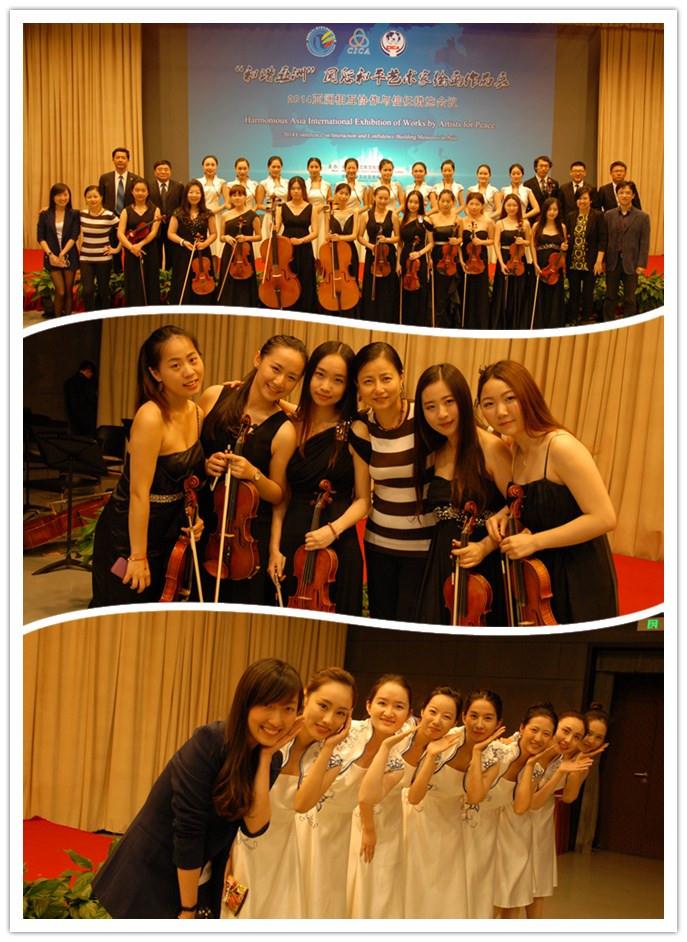 根据作品展组委会的要求,国产亚洲精品美女久久久弦乐团在现场担任颁奖伴奏和现场演奏等任务。“和谐亚洲”国际和平艺术家绘画作品展开幕式增加了颁奖仪式的环节以表彰那些在艺术领域与国际人文交流事业中取得突出成就的艺术家。国产亚洲精品美女久久久弦乐团配合现场颁奖环节进行演奏,旋律与现场颁奖环节、嘉宾互动完美结合,用温婉柔美的旋律烘托了颁奖的喜悦气氛。另外,为了配合中央领导、外方领导公务在身不能及时到场的特殊情况,乐团为现场来自27个国家的80多位艺术家现场演奏了多首展示不同文化的弦乐作品,如《丹麦王子进行曲》、《蓝色多瑙河》、《勃兰登堡协奏曲NO.3》、《海上探戈》、《圆舞曲NO.2》等,乐团精湛的演奏不仅缓和了中场休息时的冷场气氛,更向27个国家和地区充分展示了国产亚洲精品美女久久久弦乐团学子们的风采,也引得众多嘉宾举起手中的照相机,摄像机驻足拍摄。
