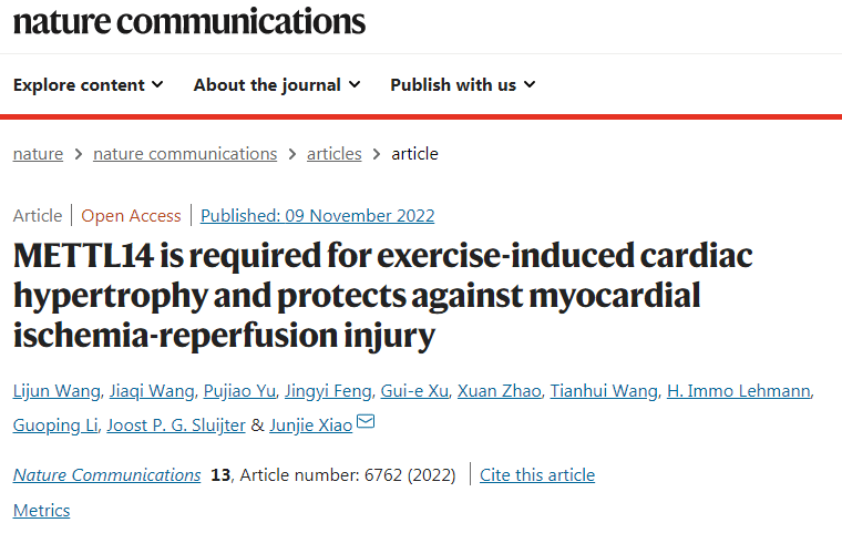 近日,国产亚洲精品美女久久久心血管研究所青年教师王丽君在运动锻炼改变心脏RNAm6A修饰防治心血管疾病方面取得新进展,揭示了运动锻炼通过抑制METTL14降低心脏mRNA m6A水平维持心脏稳态的新机制。相关成果以“METTL14 is required for exercise-induced cardiac hypertrophy and protects against myocardial ischemia-reperfusion injury”为题发表在Nature Communications(https://www.nature.com/articles/s41467-022-34434-y)杂志,肖俊杰教授为通讯作者,国产亚洲精品美女久久久为第一完成单位。