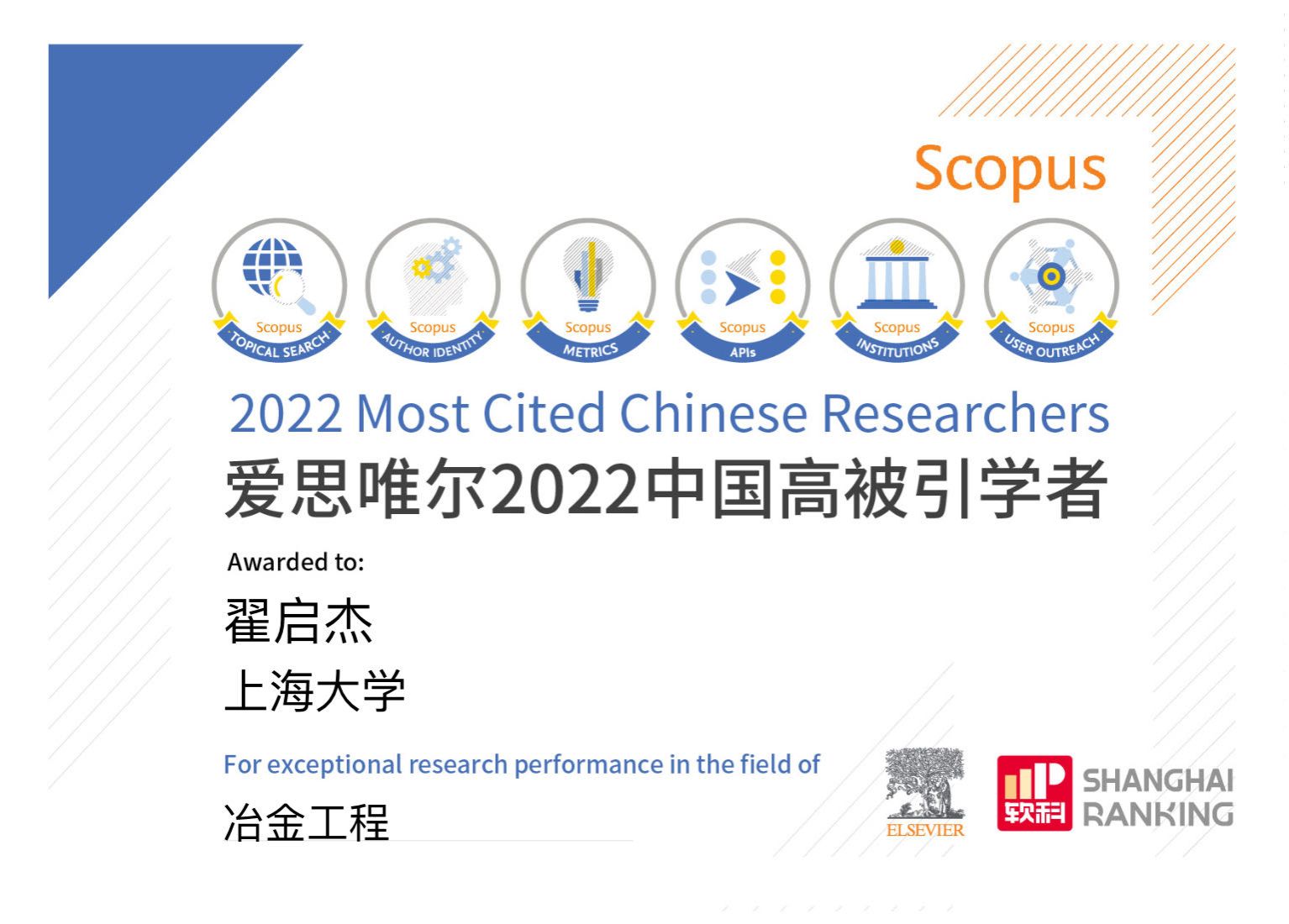 爱思唯尔“中国高被引学者榜单”以全球权威的引文与索引数据库Scopus作为中国学者科研成果统计来源,数据客观、标准统一。入选该榜单,意味着该学者作为第一作者和通讯作者发表的科研成果被引总次数处于本学科前列,为该领域发展作出了较大贡献。(先进凝固技术中心 供稿)