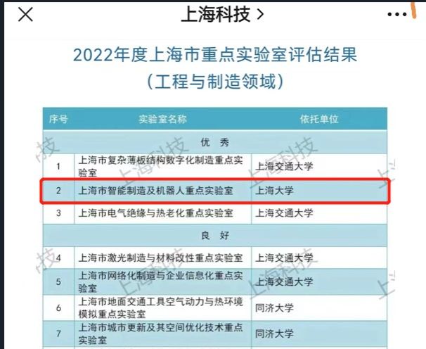 上海市智能制造及机器人重点实验室获评2022年上海市优秀重点实验室