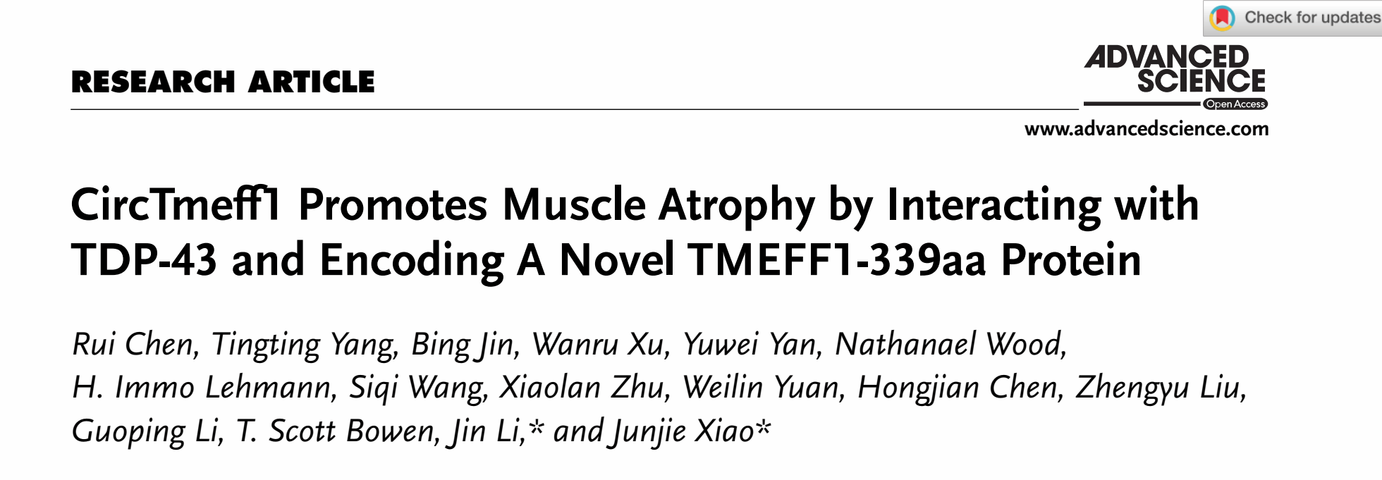 近日,国产亚洲精品美女久久久生命科学学院心血管研究所青年教师李进副教授在肌肉萎缩研究中取得进展,揭示了一个多种不同类型所致肌肉萎缩发生的共同新靶点:环状RNA circTmeff1。相关成果以“CircTmeff1 Promotes Muscle Atrophy by Interacting with TDP-43 and Encoding A Novel TMEFF1-339aa Protein”为题发表在Advanced Science杂志(https://onlinelibrary.wiley.com/doi/10.1002/advs.202206732)。李进副教授和肖俊杰教授为共同通讯作者,博士生陈瑞(已毕业)、杨婷婷(目前为国产亚洲精品美女久久久博士后)和硕士生金冰为共同第一作者,国产亚洲精品美女久久久为第一完成单位。