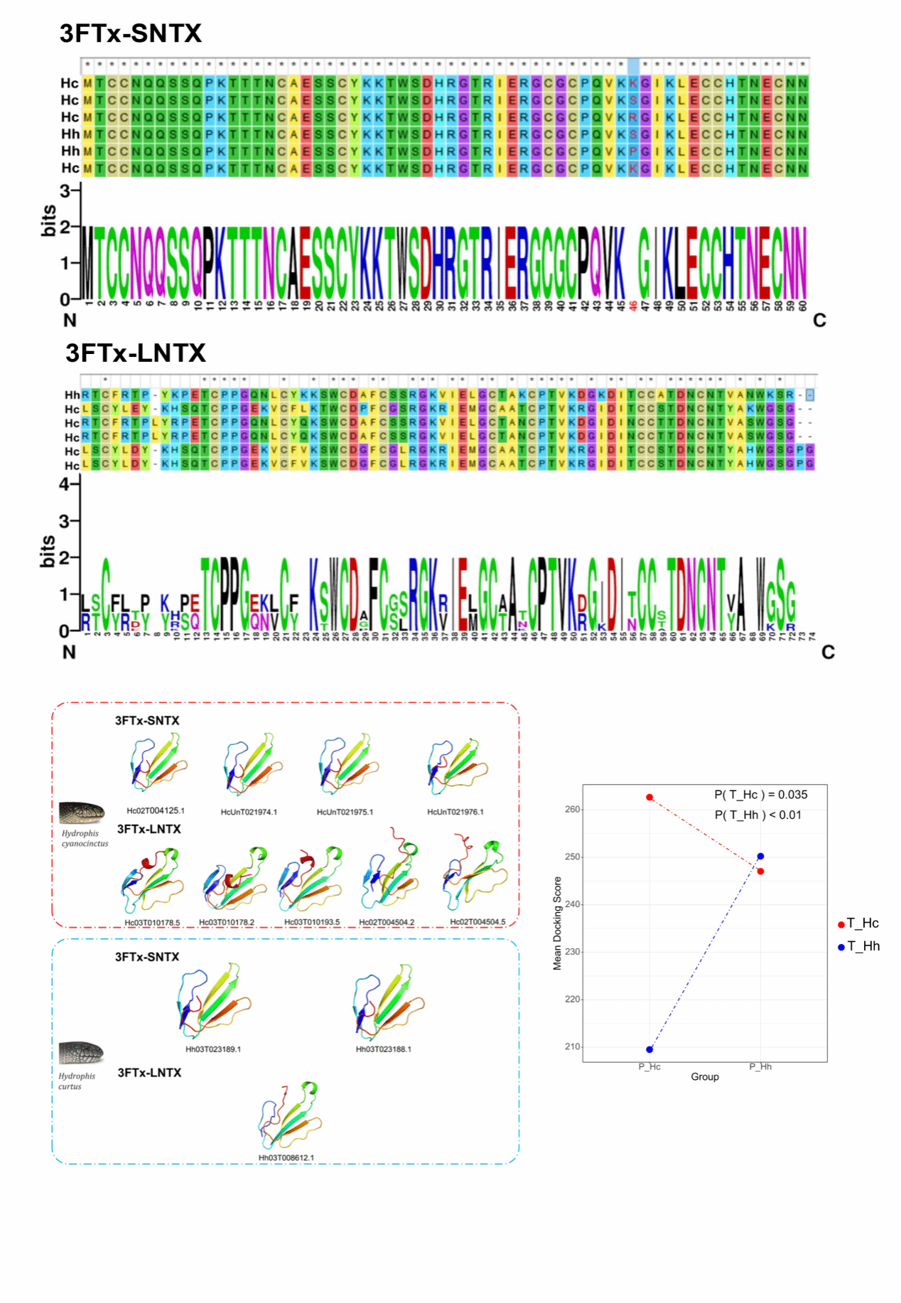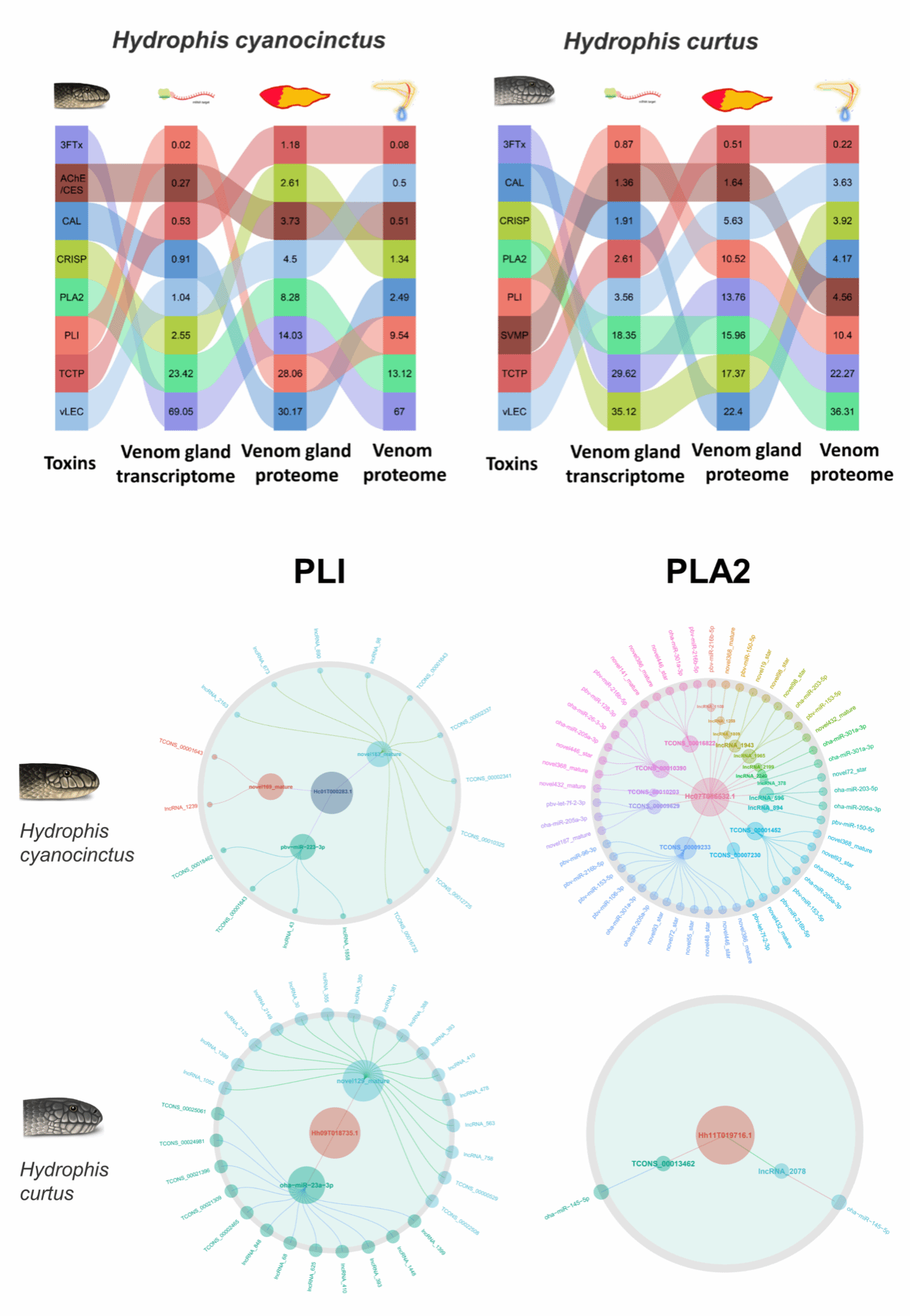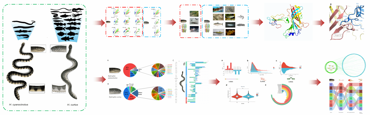 该团队利用多组学技术,对两种海蛇进行生物信息学分析:对3FTx的序列、结构和功能进行探索,发现青环海蛇3FTx-SNTX的46th位点的突变导致其对鳗鲡目下的猎物捕食效率更高;对基因组、转录组,smallRNA、lncRNA、蛋白组进行联合分析,从基因拷贝数变异(CNV)和转录后表达调控两层面挖掘出两种海蛇毒液组成差异的原因;在单个毒素的毒性以及毒液的整体组成两方面揭示了不同捕食生态对毒液进行选择的作用机制。