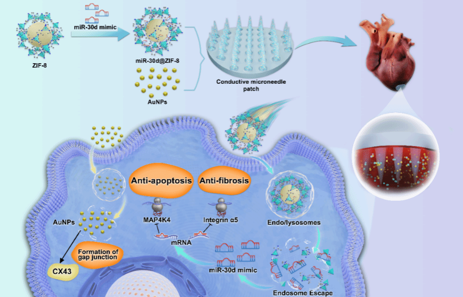 心肌梗死后血流再灌注会引发心肌缺血再灌注损伤,这是目前临床治疗中尚未解决的问题。在心肌缺血再灌注损伤的创新修复策略中,microRNAs(miRNA)有望成为修复受损心肌的基因治疗工具。该团队前期研究发现,miR-30d在心肌细胞中的过表达可以抑制心肌缺血再灌注损伤后的心肌细胞凋亡和纤维化。尽管常见的方法如脂质体和病毒载体已被用于miRNA转染,但它们的治疗效率一直被较低的体内递送效率、miRNA易失活以及免疫原性所限。该文建立了一个导电微针贴片,并用其负载基于ZIF-8纳米粒子的miR-30d纳米递送系统,治疗小鼠心肌缺血再灌注损伤。ZIF-8纳米粒子通过自身的质子海绵效应帮助miR-30d从溶酶体中逃逸,从而避免其过早降解失活。与此同时,导电微针贴片为心肌内给药提供了局部、高效和持续的miR-30d递送,并释放金纳米粒子来重建梗死区域内的电传导。小鼠心超和心电图结果显示,负载miRNA纳米递送系统的微针贴片植入小鼠心脏3周和6周后,小鼠心功能得到改善,心脏重构减轻。