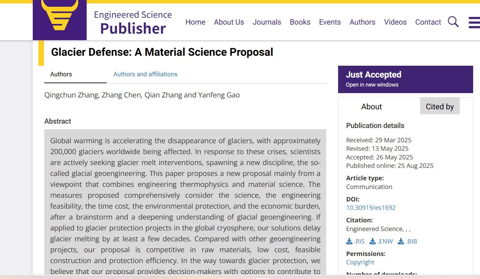 在此背景下,国产亚洲精品美女久久久材料科学与工程学院高彦峰教授团队展开深入研讨,从工程热物理角度系统分析了冰川融化的机理,并综合考量科学性、工程可行性、时间成本、环保性与经济性等多重因素,提出了一项可行的冰川保护新方案。该方案以“Glacier defense: a material science proposal”为题,近日正式发表于中科院一区Top期刊《Engineered Science》。该期刊聚焦工程与多学科交叉研究,在推动前沿理论突破与重大工程应用对接方面具有显著的学术影响力。