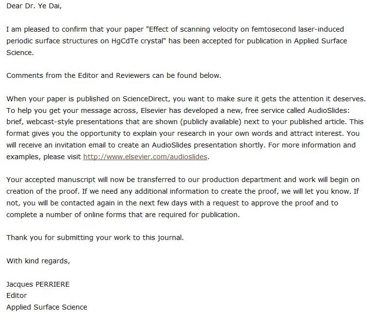 近日,理学院物理系戴晔副教授指导的物理系本科生顾宏安(男)作为第一作者的论文《扫描速度对于碲镉汞表面自组织周期性结构的》(“Effect of scanning velocity on femtosecond laser-induced periodic surface structures on HgCdTe crystal”)被SCI期刊《Applied Surface Science》(2016 IF:3.387)接收发表。