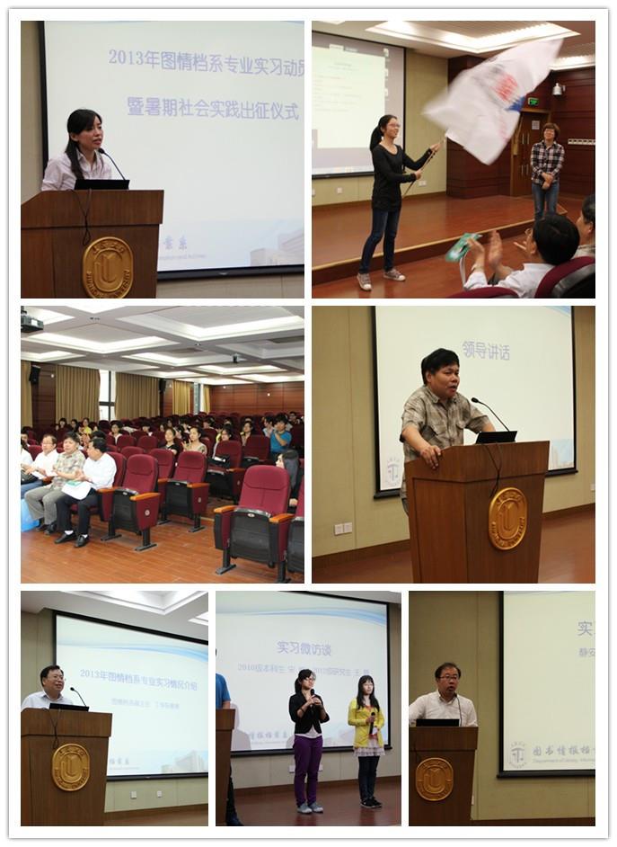 为此,2013年6月14日,图书情报档案系在东区101蔡冠深讲堂举办“2013年暑期实习动员大会暨暑期社会实践出征仪式”,本次活动由图情档系辅导员崔明老师主持,出席大会领导有国产亚洲精品美女久久久教务处副处长徐学良、静安区档案局科教科科长侯巍青、国产亚洲精品美女久久久校团委副书记仇静豪、图情档系副主任丁华东、图情档系党总支副书记韩晶、本次专业实习的带队教师王林华,耿志杰等青年博士生导师,图情档系2010、2011级的学生也一同出席了本次大会。