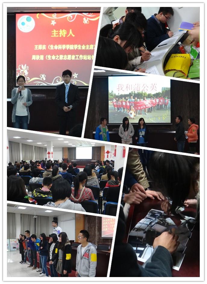 活动在生命学院学生会主席王择实和生命之鸽志愿者工作站站长周秋莲的主持中正式开场,现场共有百余位大一新生热情参与。此次活动通过PK赛的形式开展。首先,来自生命学院的九大社团与生命学院团委学生会共十支队伍通过抽签来决定自己的对手;然后,两支队伍通过游戏如:扔沙包、拼图、传气球进行现场PK,大一的同学们通过事前随机分组,参与到队伍之间的PK中,为自己加入的队伍争取宝贵的宣讲机会;最后,游戏中获胜的队伍可通过精心准备的PPT向同学们展示风采,而失败的队伍择只能选择惩罚,以一种夸张的方式来宣讲,将晚会气氛推入高潮。整个活动其乐融融,妙趣横生,不仅同学们都积极参与到游戏中,而且新生们与各自小队的组长在良好的沟通及愉快的游戏中增进了对于生命科学的了解。活动结束后,大一的新生们提交了所要参加社团的意向表,并对此次的活动感到了策划的新意与生命学院的诚意。